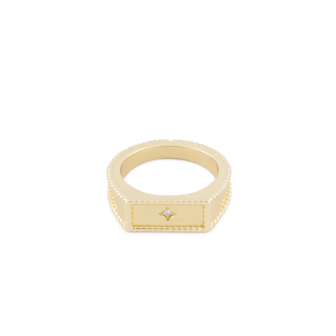 The Gold Moonlight Ring is a classic rectangle ring design with a star setting on the face and rope detailing. The ring is made from 14KT Gold Plated, 925 Sterling Silver, and is hallmarked by Great British Assay Offices verifying its quality.