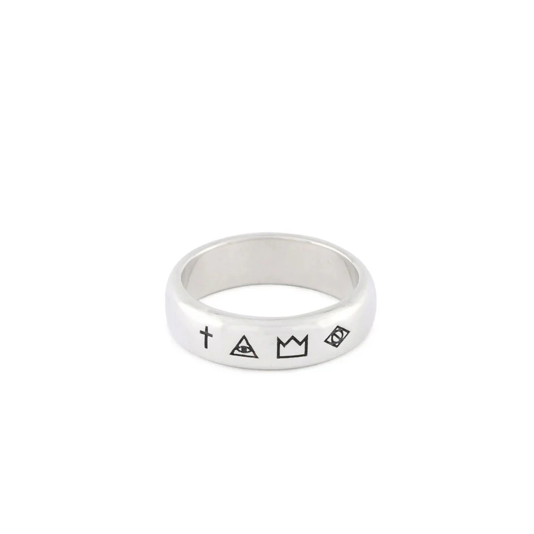 The Silver 4 Symbols ring is a piece that can be worn daily either on its own or pairing with other styles. The band style is perfect for stacking with pieces such as the Traditional Hallmark Ring.
