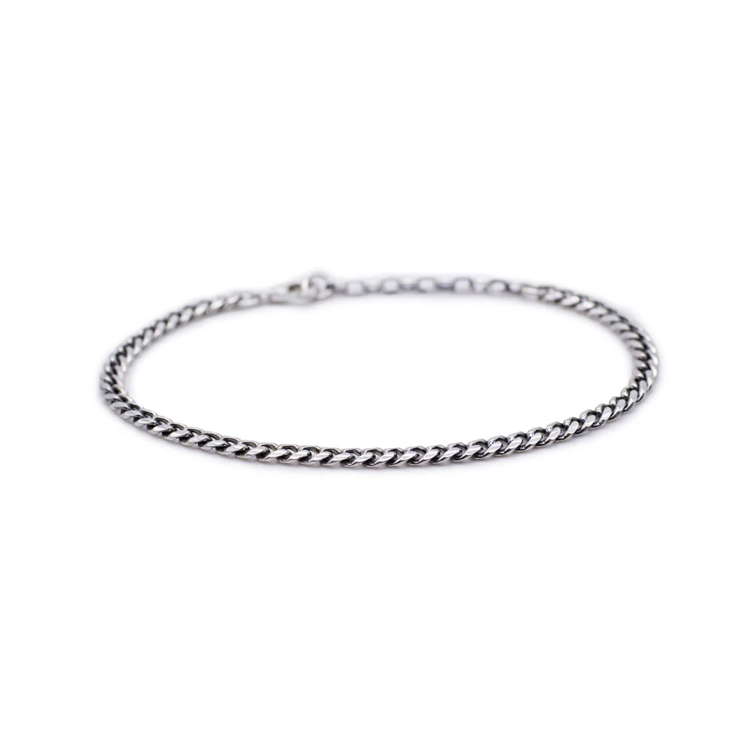 The Silver 4mm Curb Bracelet consists of concave curb links in an oxidised finish and adjustable length. The bracelet is made from 925 Sterling Silver and is hallmarked by Great British Assay Offices verifying its quality.