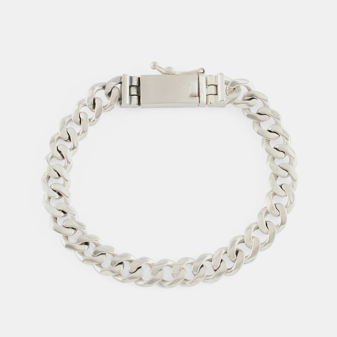 The Silver Curb Bracelet is a chunky, classic bracelet made from thick, smooth links and a statement box clasp. The bracelet is forged from 925 Sterling Silver and is hallmarked by Great British Assay Offices verifying its quality.