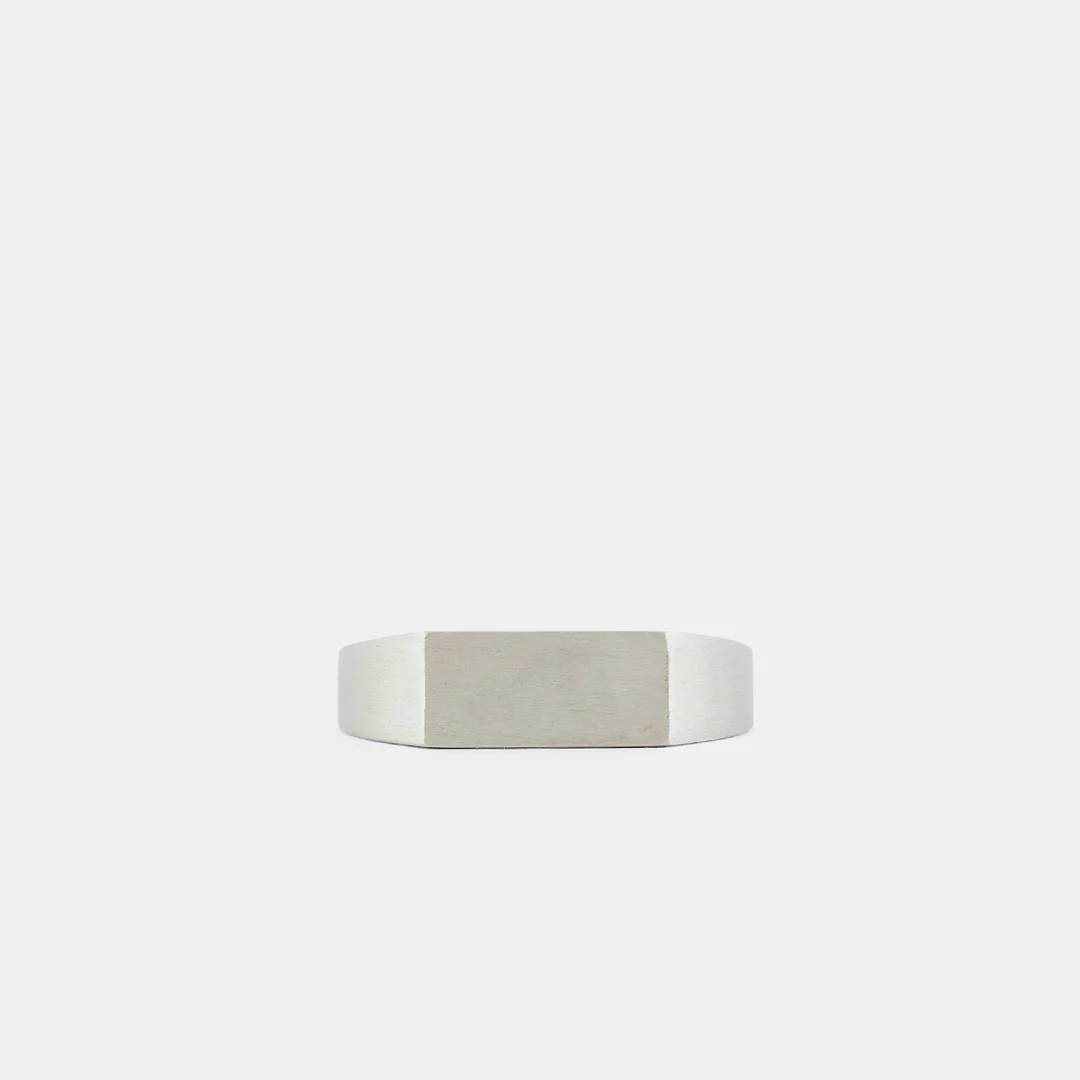 The Brushed Rectangle Ring is a slim rectangle shaped signet ring with clean edges, made from solid Sterling Silver for a heavy weight and high quality. The ring has a brushed finish on the outer surfaces, while the inside and edges of the ring are polished, giving a unique texture change to the ring and a premium finish. The ring is plated in Rhodium, giving it a polished, bright Silver look that won't age and discolour. Rhodium plating is a premium Silver coloured plating that gives the jewellery a polished, reflective finish however with the brushed finish it creates a soft, brighter silver appearance as opposed to a reflective surface. As it is part of the platinum metal family, it is harder than gold so provides jewellery with a durable surface which resists tarnish.
