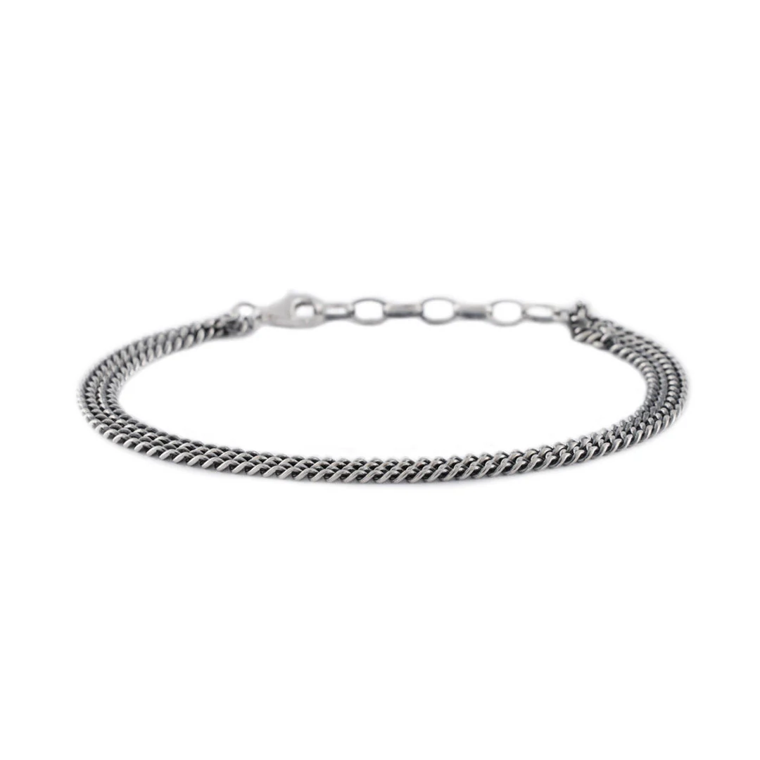 The bracelet consists of two 2.5mm curb chains with an oxidised finish for a layered look. The bracelet can be adjusted from 17cm to 20cm and is finished with a Sterling Silver lobster clasp. Layer the bracelet with other pieces such as the Silver Rope Bracelet for a classic look.