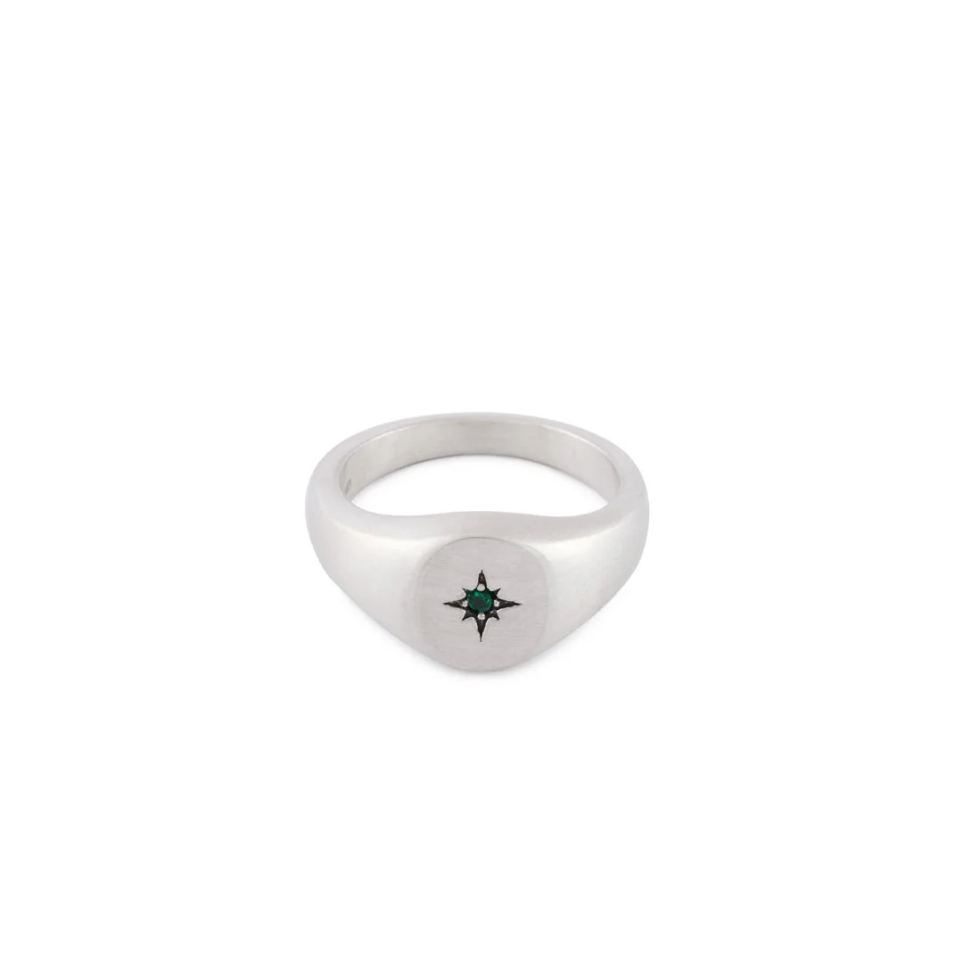 The Silver Envy Signet Ring is a classic signet shape with a Green stone on the face. The ring is made from 925 Sterling Silver and is hallmarked by Great British Assay Offices verifying its quality.