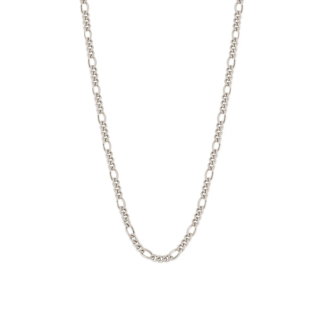 The Figaro Necklace is a slim necklace, approx 3.5mm thick, consisting of 3 small links followed by 1 elongated link. The necklace is finished in a premium Rhodium Silver plating that won't discolour or age. Rhodium plating is a premium Silver coloured plating that gives the jewellery a polished, reflective finish. As it is part of the platinum metal family, it is harder than gold so provides jewellery with a durable surface which resists tarnish.