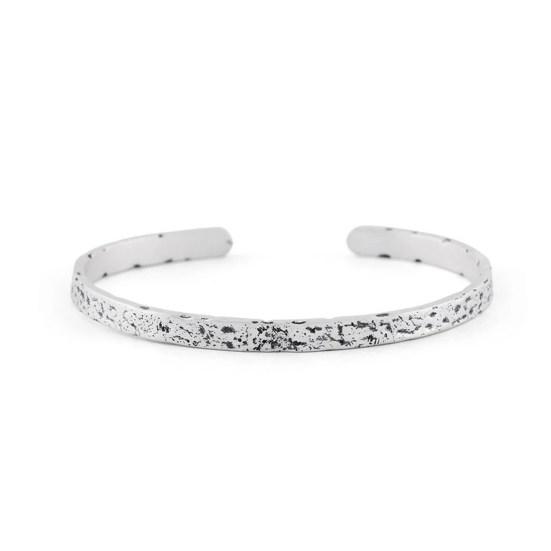 The Silver Forge Cuff is an essential piece with a distressed and heavily oxidised finish. The cuff is made from 950 Silver, and is hallmarked by Great British Assay Offices verifying its quality.