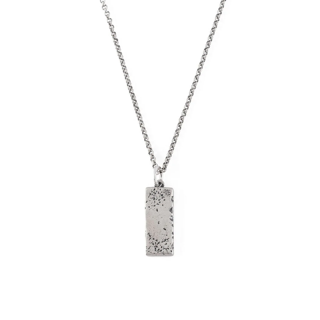 The Silver Forge Necklace is a distressed rectangle pendant with a heavily oxidised finish. The necklace is made from Sterling Silver, and is hallmarked by Great British Assay Offices verifying its quality.