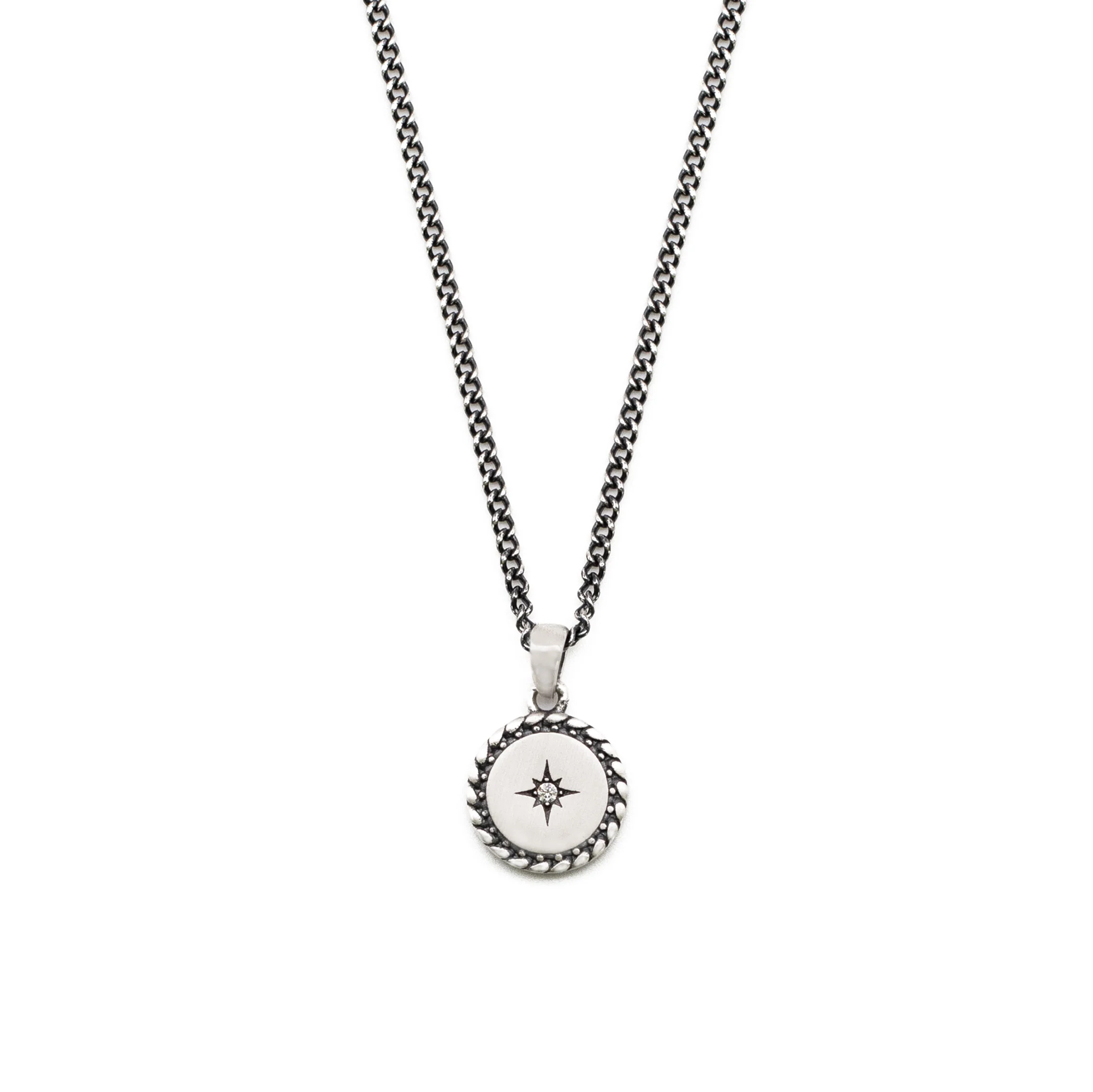 The Silver Guard Necklace is a small round pendant with a detailed border and star setting holding a cubic zirconia stone. The necklace is made from Sterling Silver, and is hallmarked by Great British Assay Offices verifying its quality.