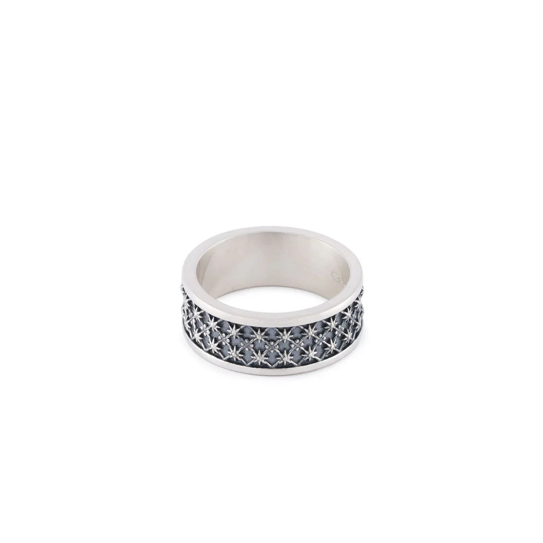 The Silver Jacquard Ring is a thick band ring with intricate detailing and a smooth inside for comfort. The ring is made from 925 Sterling Silver and is hallmarked by the Goldsmiths' Company Assay Office verifying its quality.