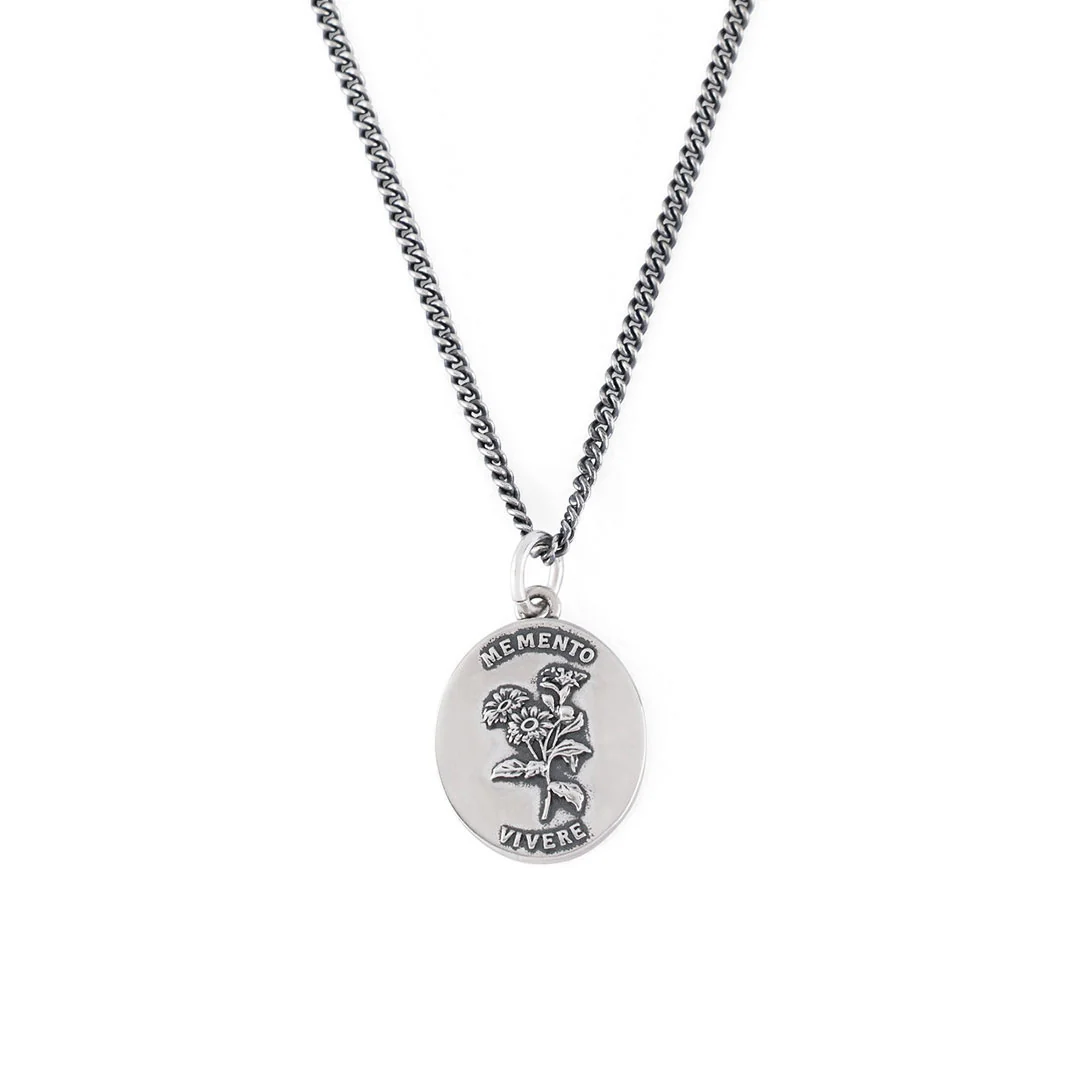 The Silver Memento Necklace is an oval pendant featuring floral depictions and a latin quote that translates to "Remember to Live". The necklace is made from Sterling Silver, and is hallmarked by Great British Assay Offices verifying its quality.
