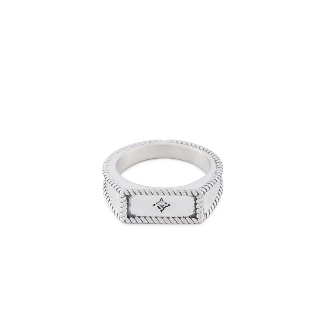 The Silver Moonlight Ring is a classic rectangle ring design with a star setting on the face and rope detailing. The ring is made from 925 Sterling Silver, and is hallmarked by Great British Assay Offices verifying its quality.