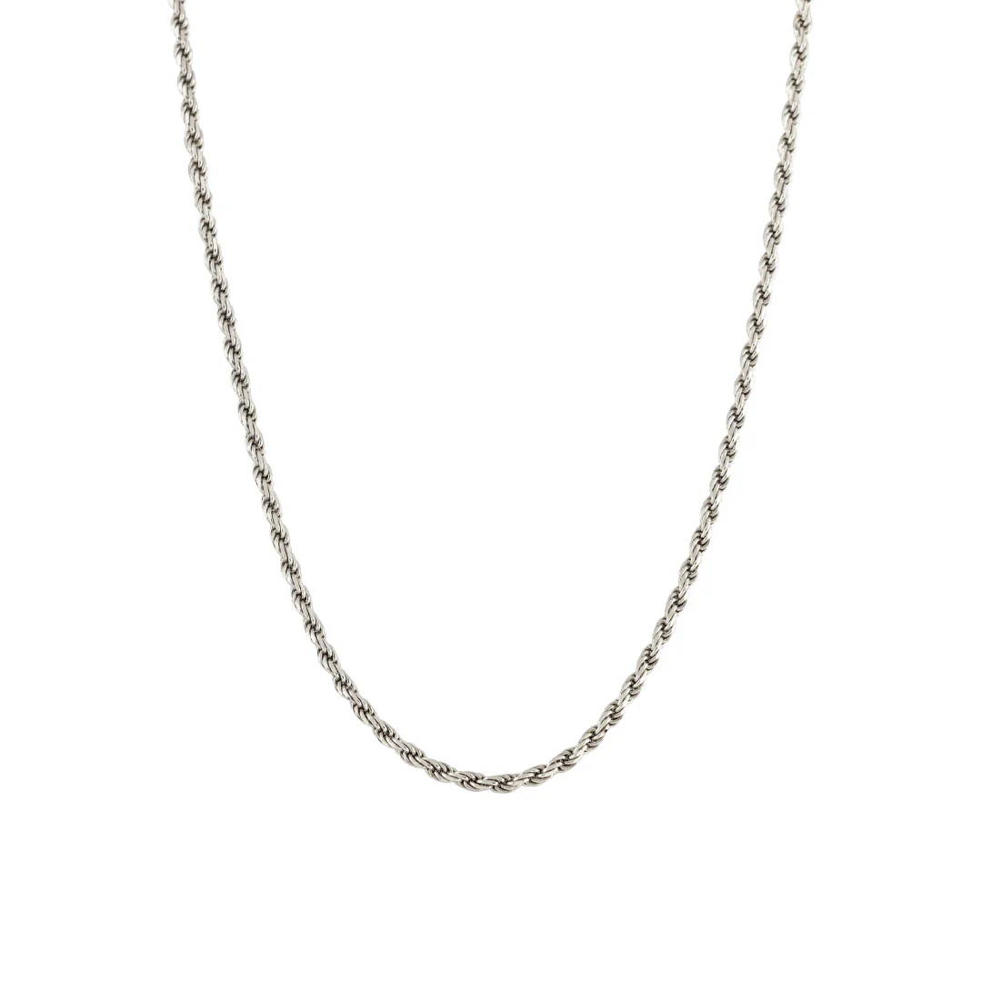 The Rope Necklace is a slim necklace, approx 2.5mm thick, consisting of tightly woven links twisted together to create a rope effect. The necklace is finished in a premium Rhodium Silver plating that won't discolour or age. Rhodium plating is a premium Silver coloured plating that gives the jewellery a polished, reflective finish. As it is part of the platinum metal family, it is harder than gold so provides jewellery with a durable surface which resists tarnish.