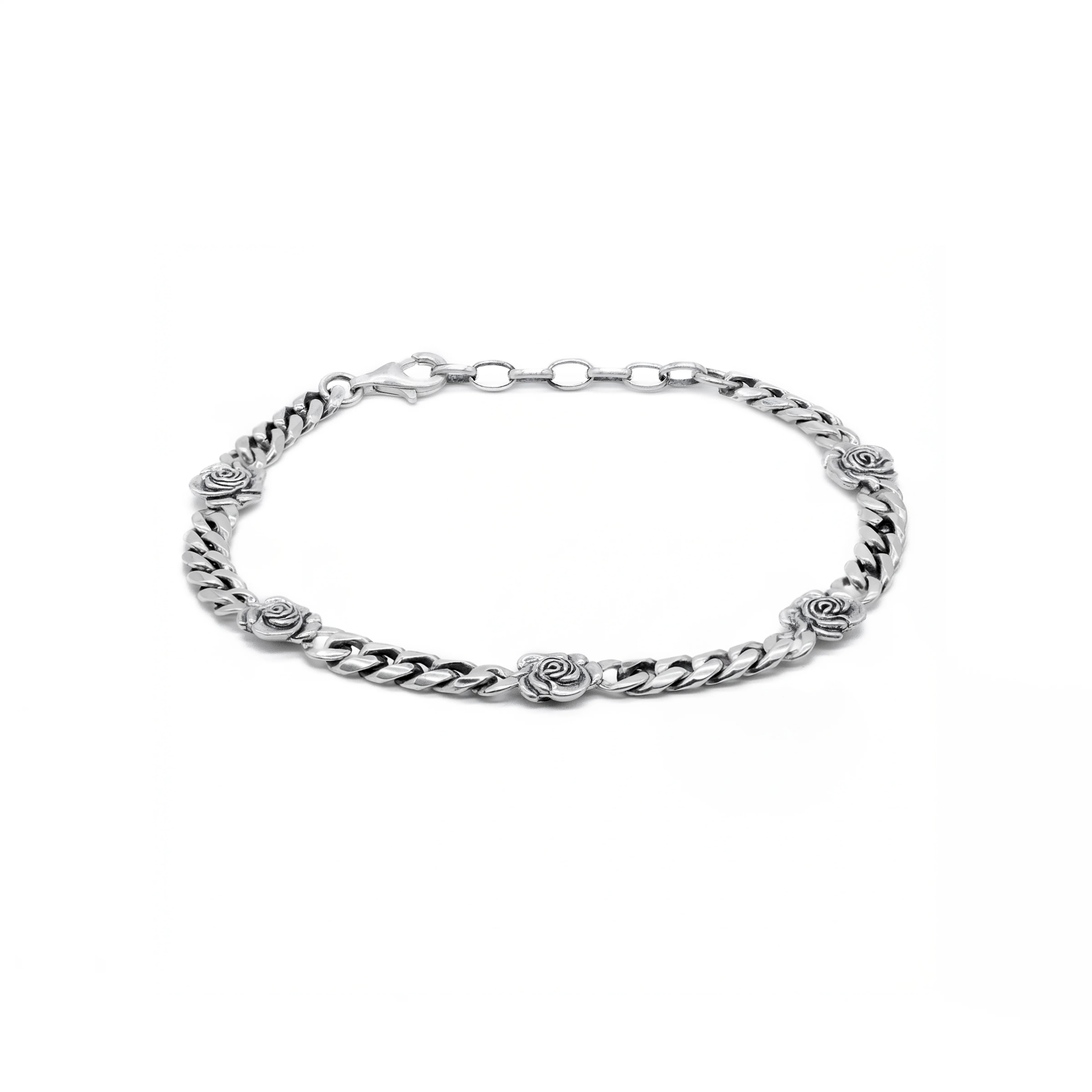The Rose Bracelet is a 3mm curb chain featuring a detailed rose motif repeated around the chain and finished with an oxidised look to highlight the detailing. Complete with a lobster clasp and adjustor chain so the piece can be adjusted from 17cm - 20cm.